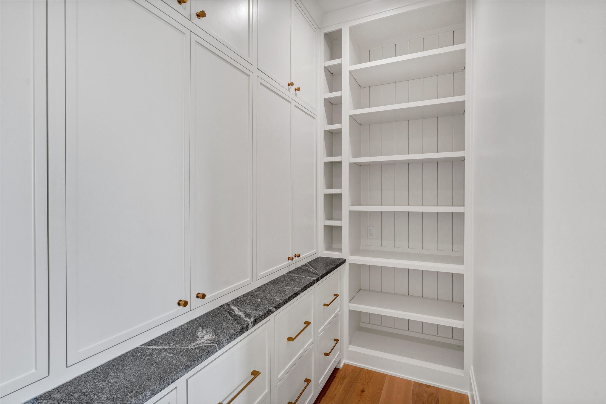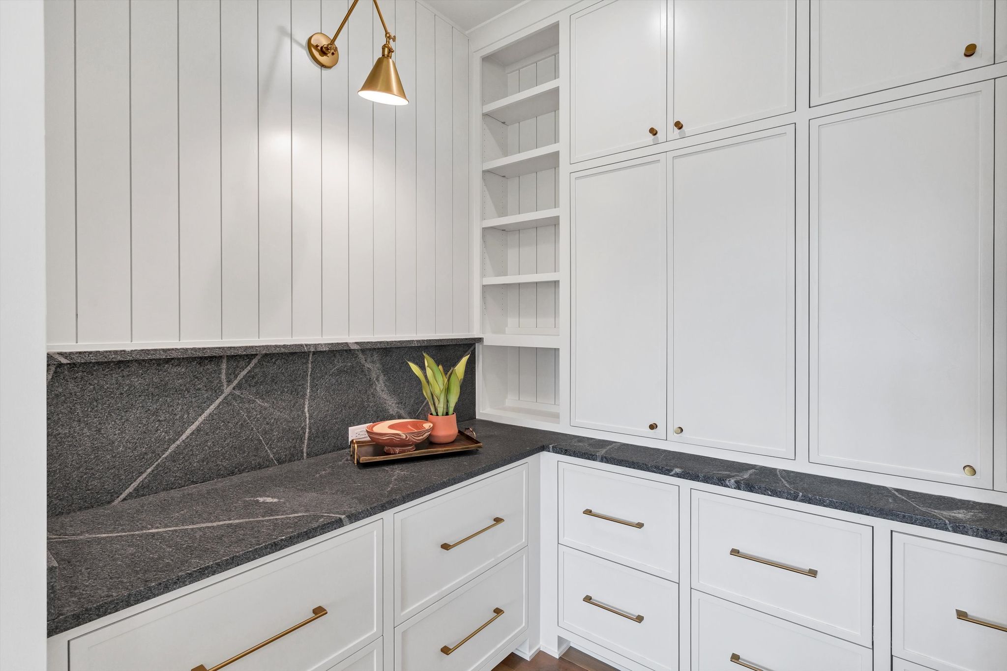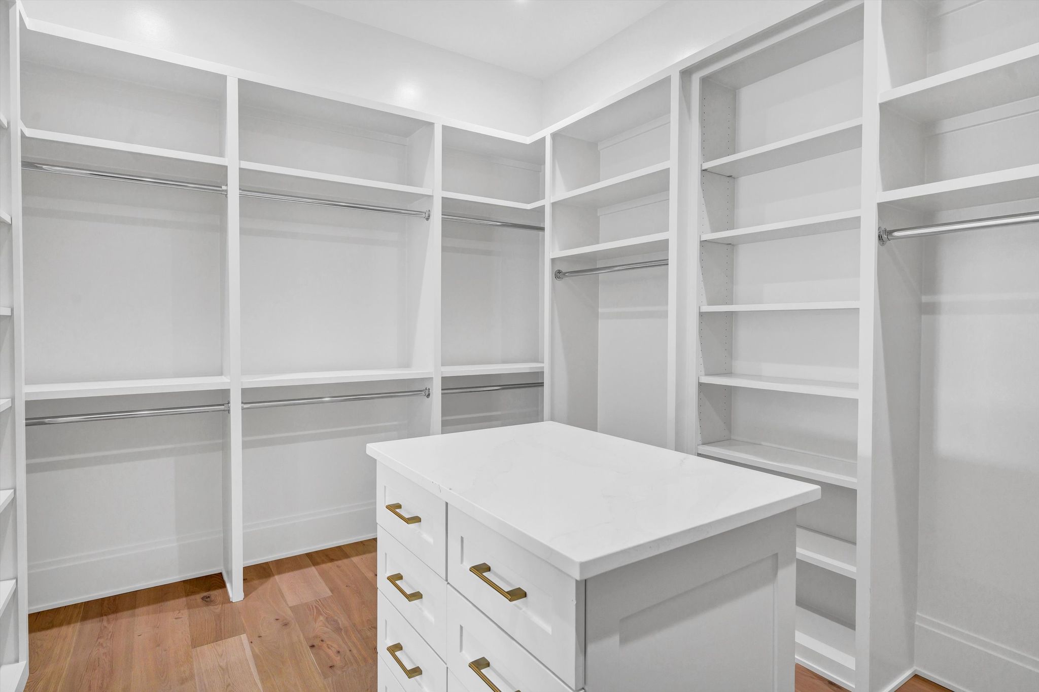 chandelier. His and Hers closets offer custom storage solutions, and the